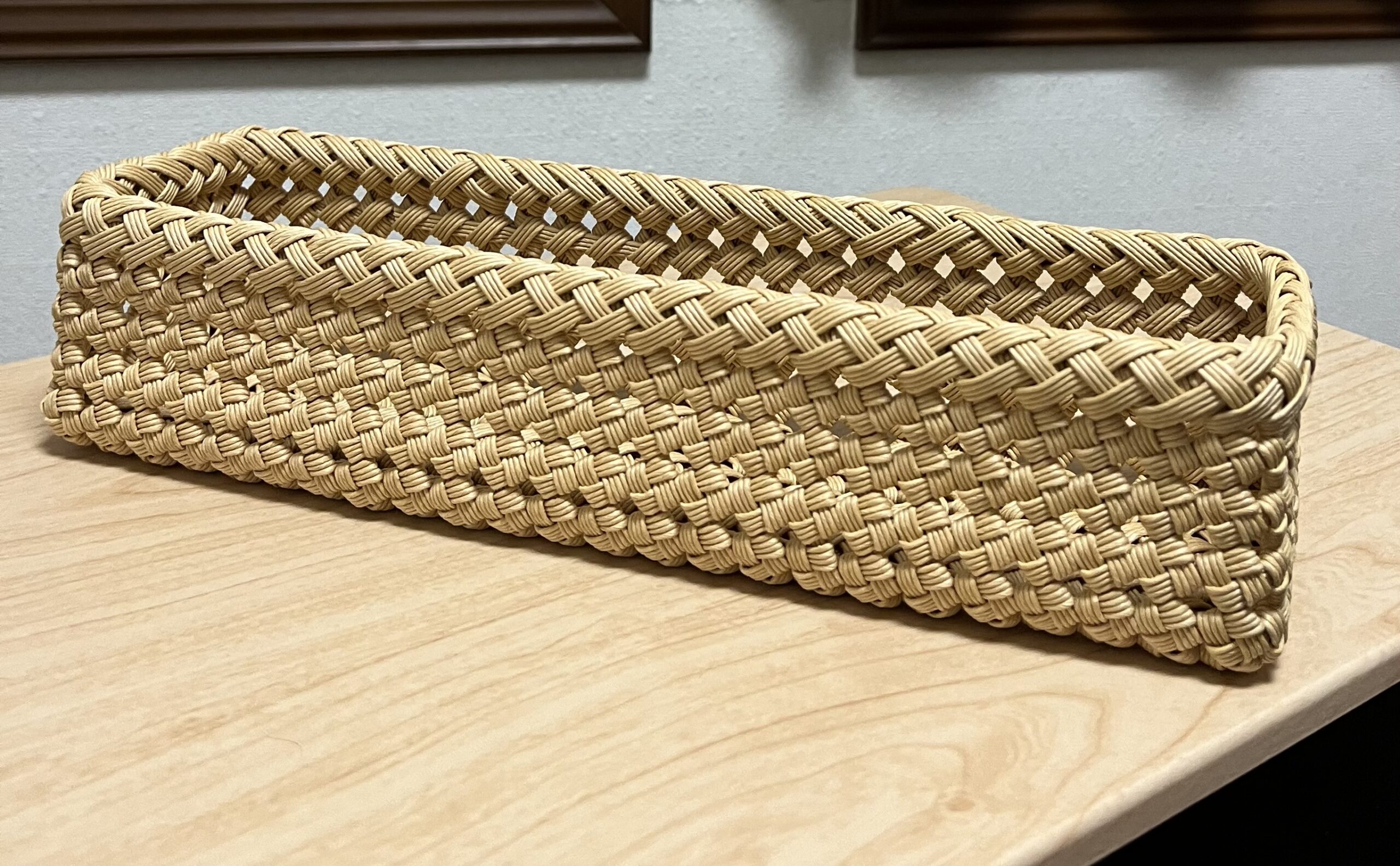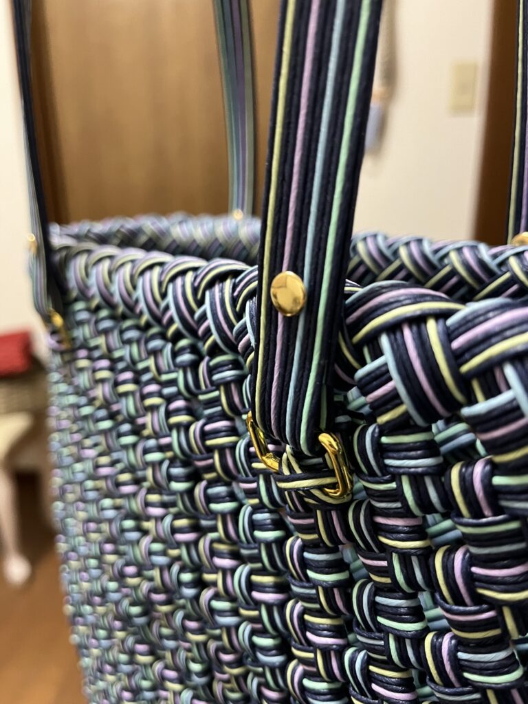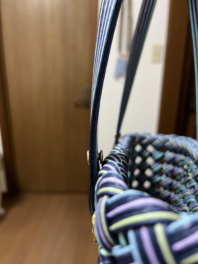紙バンド3枚分の厚みに対して、カシメの足を8mmにしてみました。厚さが4mmのものに対応するということでしたが、少し隙間ができる感じです。目打ちで穴を開け、金づちで打ち込み完成です。まあ、思った通りの手間だったかな〜。異素材を入れると締まりますね、いい感じになったと思いますv